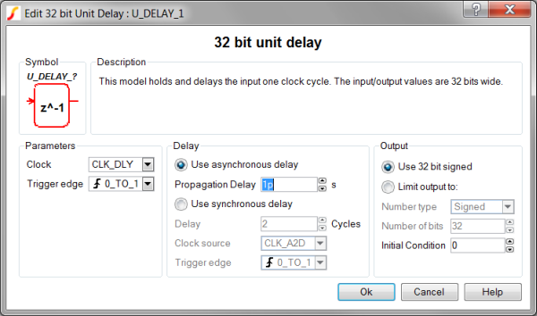 The SystemDesigner Unit Delay models a unit delay in the z-domain. The model used by the Unit Delay is identical to the Data Register; only the symbol is different. The Unit Delay can be clocked with any SystemDesigner clock. From the Output parameter box, you can limit the resulting output to either signed or unsigned numbers with fewer than 32 bits.