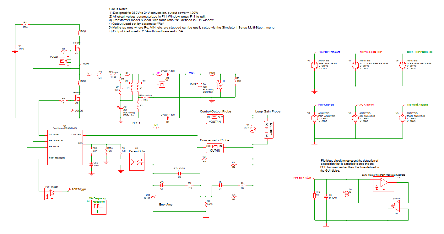 The Output POP progress check box is checked in this example schematic so we can illustrate the Pre-POP transient analysis is run first, followed by the simulation of a fixed number of switching cycles, and then followed by the core POP process.