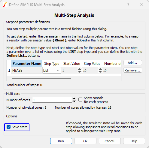 When running multi-step or Monte Carlo simulations, you can instruct SIMPLIS to create an initial conditions file for each step or seed value. You do this by checking the "Save state" checkbox on the Multi-Step or Monte Carlo dialog as shown below: