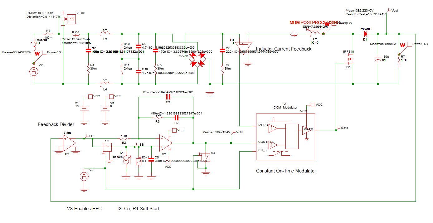 Open the schematic 3.0_PFC_Critical_Conduction_Mode_with_MDM_Inductor.sxsch which is provided in the zip archive of examples you downloaded at the beginning of this tutorial. You will see the following circuit: