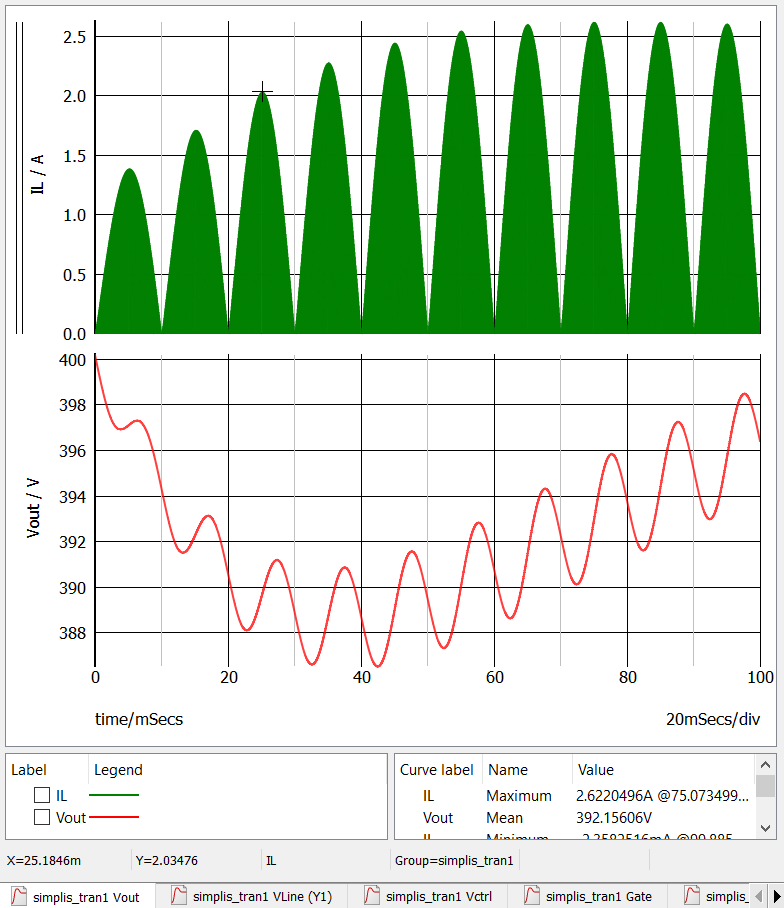 When the simulation finishes, select the simplis_tran1 Vout tab at the bottom of the Waveform Viewer. You will see that the inductor current (green) has settled into steady-state by the end of the simulation: