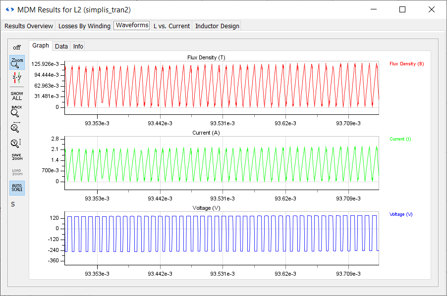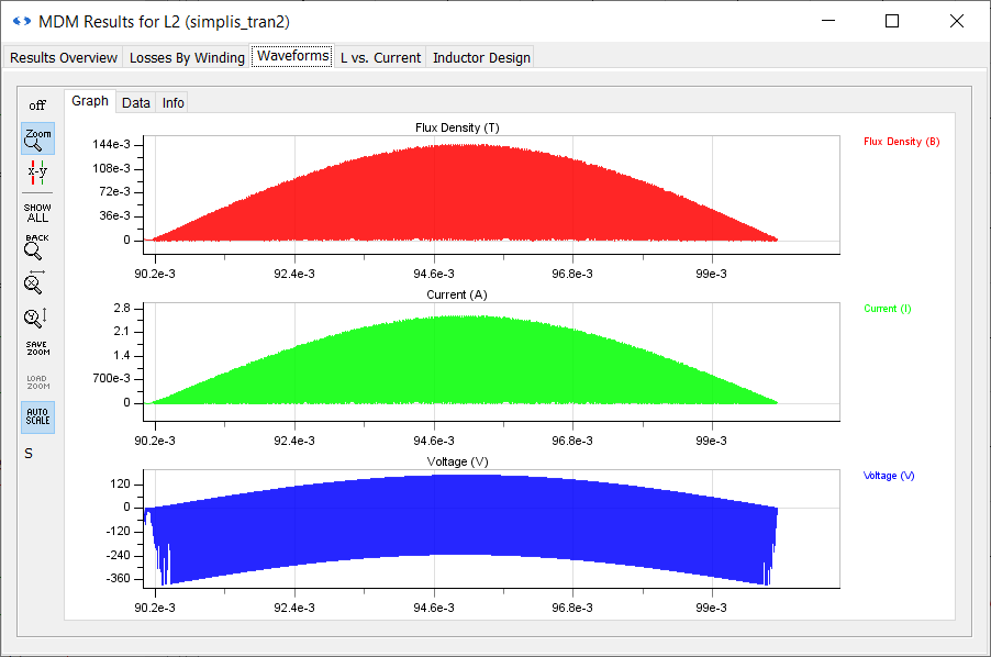 In order to accurately calculate core losses, MDM calculates the energy loss for each of these PWL flux segments and then averages the total over the 100Hz period to calculate the average power loss for the entire waveform. This is why the post-processing takes significantly longer than in the Buck converter, where the flux density waveform contains only two PWL segments. Therefore, the more complex and larger the waveform, the longer the post-processing will take.