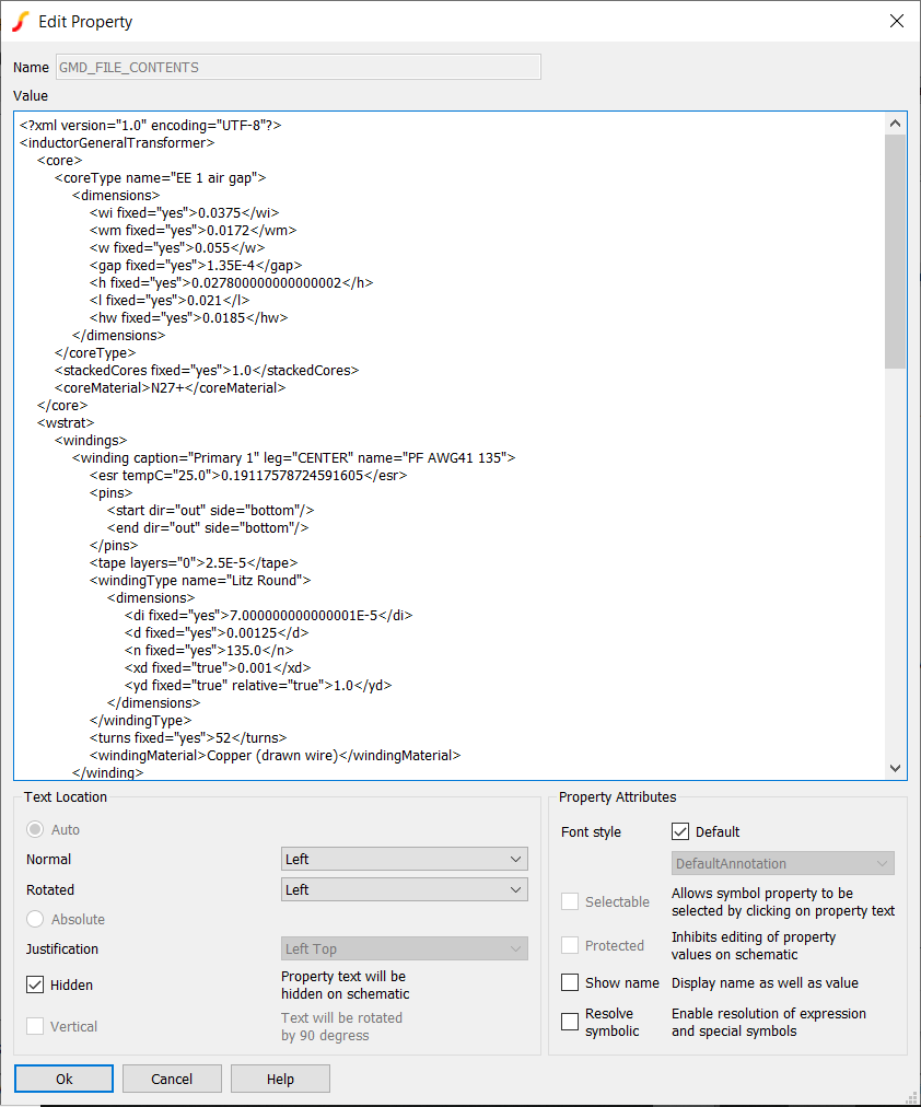 When you click Finish after creating an inductor or transformer design, a physical model of this inductor and transformer is stored by MDM in memory. However, when you shut down SIMetrix/SIMPLIS, this memory is of course cleared. To allow that physical model in MDM to be regenerated next time you start and open that same schematic, MDM generates a SIMPLIS MDM Geometry Design File that describes your design. After you click Finish, this file is not saved to disk. Rather, its contents - and XML string describing your design - are added as a symbol property to the inductor or transformer symbol you created and MDM model for.