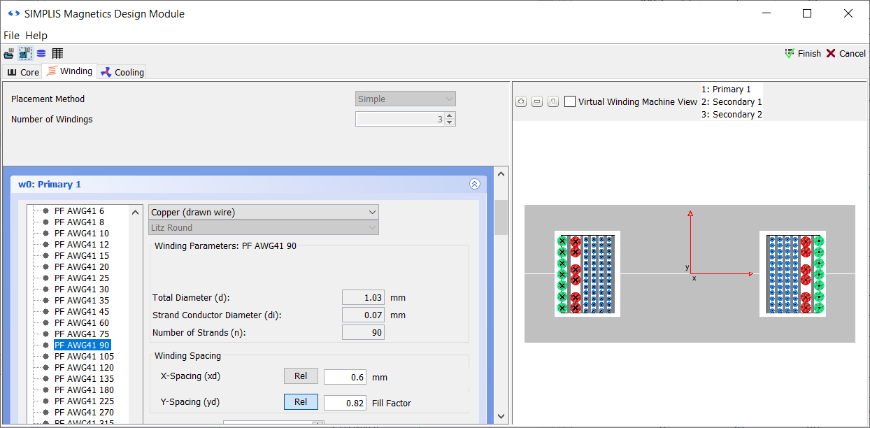 All the windings and layers in this design are separate by 0.6mm of tape. All the turns are spread out evenly along the bobbin. All windings use litz wire: Primary 1 uses single-filar PF AWG41 90, Secondary 1 is wound from double-filar PF AWG41 405 wire, and Secondary 2 from single-filar PF AWG41 405 wire.