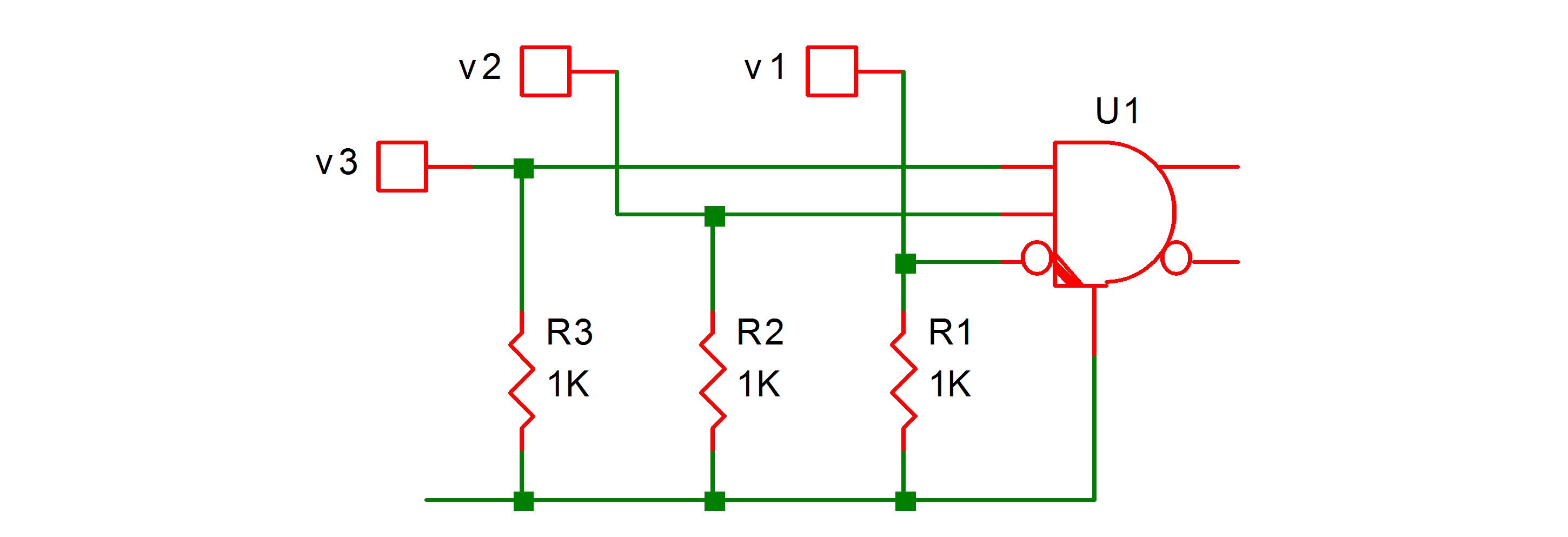 2. If most or all inputs to a simple logic gate are required to be connected to classic components, the simulation will run faster if a classic digital component is used as a front-end to drive a buffer from the Advanced Digital component library. For example, if all inputs to a three-input AND-gate are connected to classic analog components, a valid option is to have an Advanced Digital 3-input AND gate to sense the three analog inputs directly: