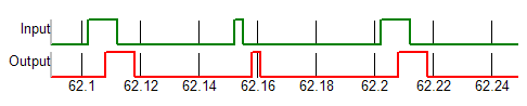 Any Input to Output delay for the new Advanced Digital components incorporates inertial delay where, if the pulse width of the incoming signal is less than the Input to Output delay of a particular device, then there is no resulting change in the output. In the example below, one of the input pulses is narrower than the input-to-output delay of a buffer logic gate. In that instance, the output of the buffer gate effectively "ignores" that one input pulse.