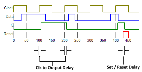 This example shows an edge triggered D-type flip flop with asynchronous set and reset. In this example, Set and Reset are selected to be active high. The following diagram shows the definition of the Clk to Output Delay as well as the Set/Reset Delay. All Flip Flop devices have a Clk to Output Delay parameter and all Flip Flops with the Set and Reset feature have a Set/Reset Delay.