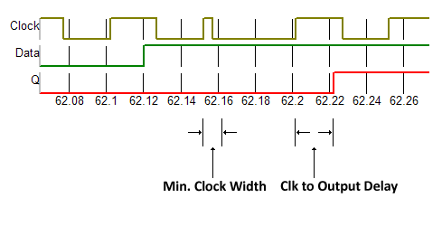 As in this example of a D-type flip flop, where the device is set to trigger on the positive going edge of the clock, if the width of the clock pulse is narrower than the specified Minimum Clock Width, the clock pulse is ignored.