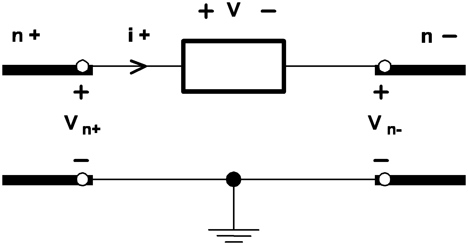 Most of the circuit elements discussed in this chapter are two-terminal elements. For any general two-terminal element, there is a positive node n+ and a negative node n- as shown in the diagram below:
