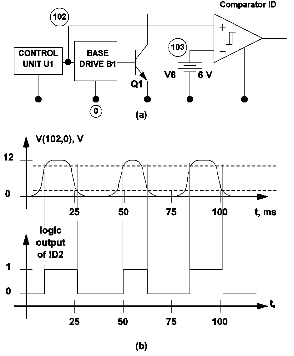 10.1 (a) A periodic triangular source, a battery, and a comparator used to define the start of a switching cycle, and (b) Output of the comparator in relationship to the differential voltage V(1,0). |