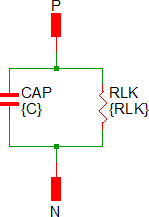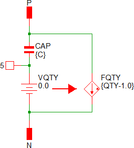 The implementation of the quantity parameter uses a "DC Transformer" technique where the capacitor's terminal current is multiplied by a constant using a Current Controlled Current Source (CCCS). This technique effectively divides all resistance and inductance values by the quantity parameter (QTY) and multiplies the capacitance by that same value. This circuitry is added if the USE_QTY parameter is set to 1.