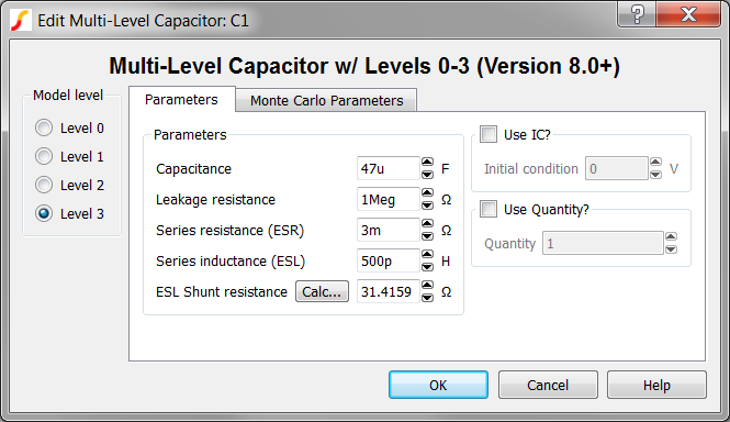Level 3 models a capacitor with ESR, ESL, and leakage resistance.