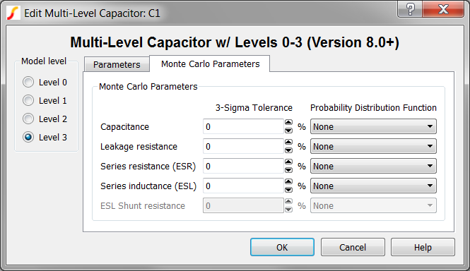 The Multi-Level Capacitor has four model levels. As the level increases, additional parasitic circuit elements are added. This capacitor, available with Version 8.0 or later, is used to model a wide variety of capacitor types where the number and type of parasitic circuit elements can be configured.