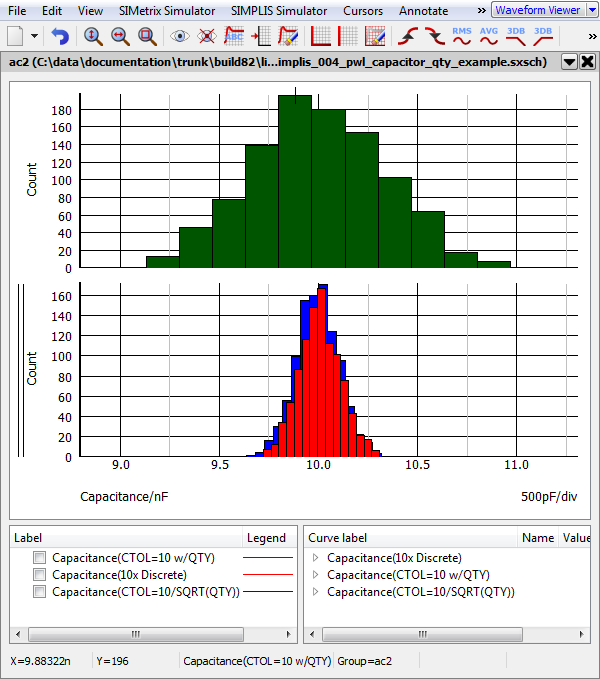 The multi-level capacitor allows you to define both the quantity of capacitors in parallel as well as the statistical distribution for those capacitors. A natural question arises: what is the distribution and standard deviation of the resulting capacitor? The answer is simple: the distribution type and tolerance entered in the dialog is the distribution of the overall parallel capacitor. Note that for some distributions, this is not the same as applying the distribution to "N" individual, parallel capacitors, and then connecting those capacitors in parallel. To demonstrate this, we have put together a demonstration circuit with three different capacitors: