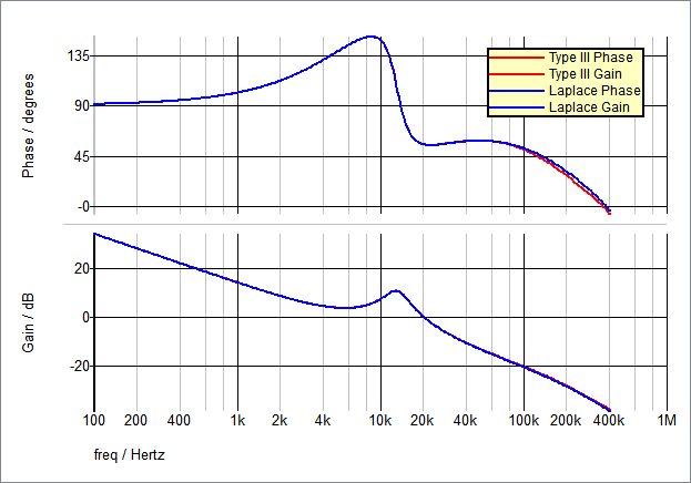 The image below is derived from two separate simulation runs where the closed loop gain and phase waveforms of the Laplace filter simulation results were superimposed over the Type III compensator simulation results. Slight variations are due to the fact that the Op Amp is not ideal.
