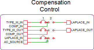 This example uses a set of jumpers to allow you to change between using the original type III compensator and the Laplace filter compensator. Select jumper position 1 to use the type III compensator and select jumper position 2 to use the Laplace filter compensator: