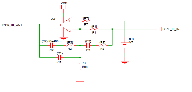 In this example, a synchronous buck converter is used to compare an OpAmp with type III compensation to a Laplace filter equivalent. The type III compensator is shown below, and the values for the resistors and capacitors are defined in the F11 window of the schematic: