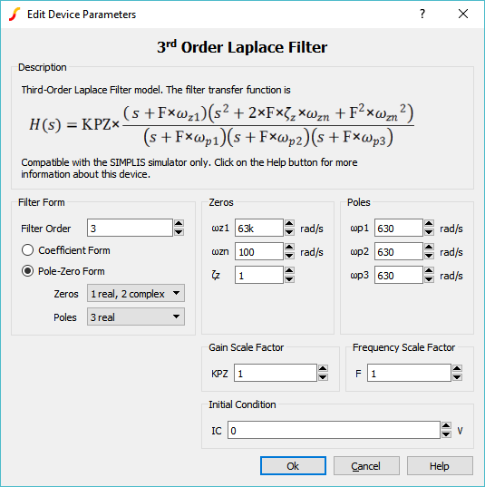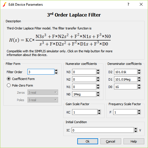 Beginning with version 8.10, an enhanced editing dialog was added allowing the transfer function to be defined in either coefficient or pole-zero form. The electrical model for the Laplace filters is unchanged from earlier versions. When using the Pole-Zero form, the dialog will calculate the coefficient form numerator and denominator values and write these values to the symbol. This calculation is performed after the dialog is closed, not after each pole or zero location is edited. This, in turn, preserves reverse compatibility with versions prior to Version 8.1. While the model will simulate in versions prior to Version 8.1, only the Coefficient Form dialog will appear and be editable. Likewise, Laplace filters placed in versions prior to 8.10 are compatible with 8.10 and future versions, both in terms of simulation and parameter editing dialogs.