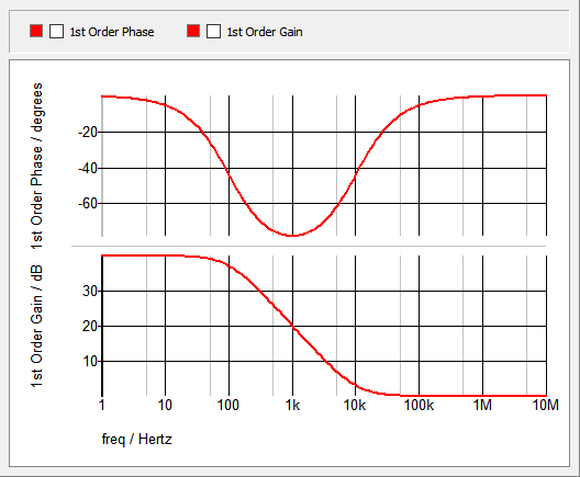 This example uses a 1st order Laplace filter to implement a single pole filter with a 100Hz frequency. Using the Pole-Zero Form, a single real pole is placed at 100Hz and no zeros are used. Also, to have a 0dB DC gain, the Gain Scale Factor is adjusted. To set the DC gain to 0dB, the transfer function is solved for "KPZ" when "S=0" and "H(s)=1", the resulting Gain Scale Factor, KPZ is {2*pi*100}.