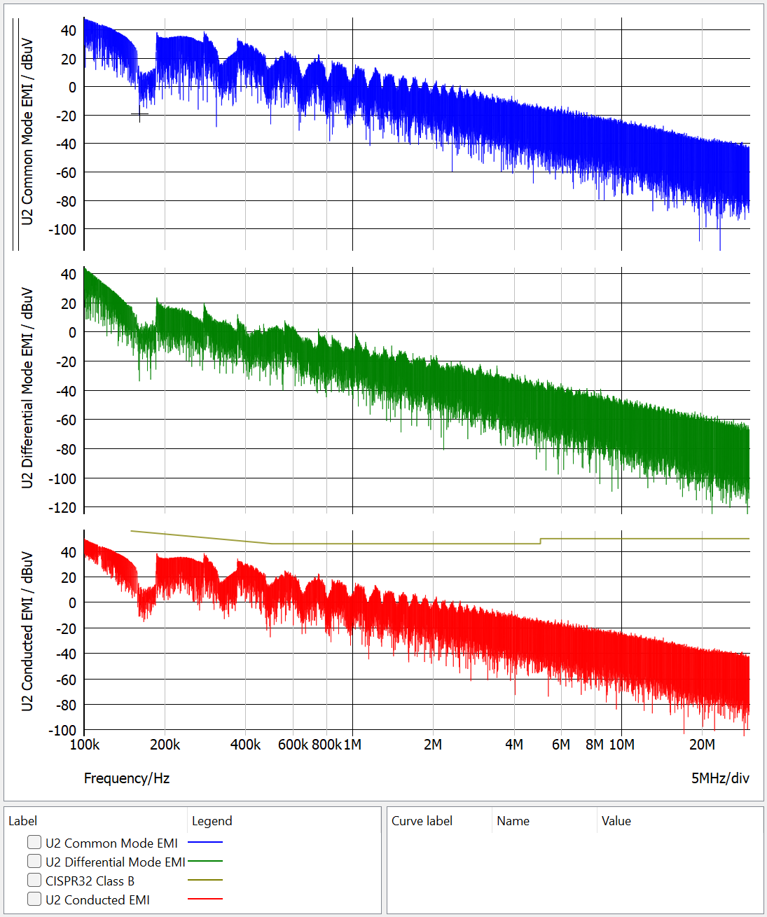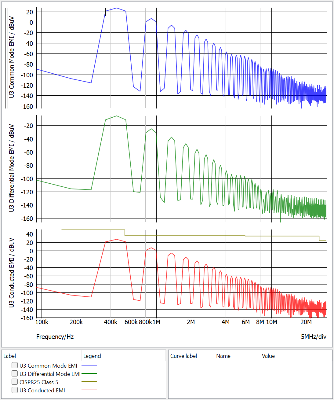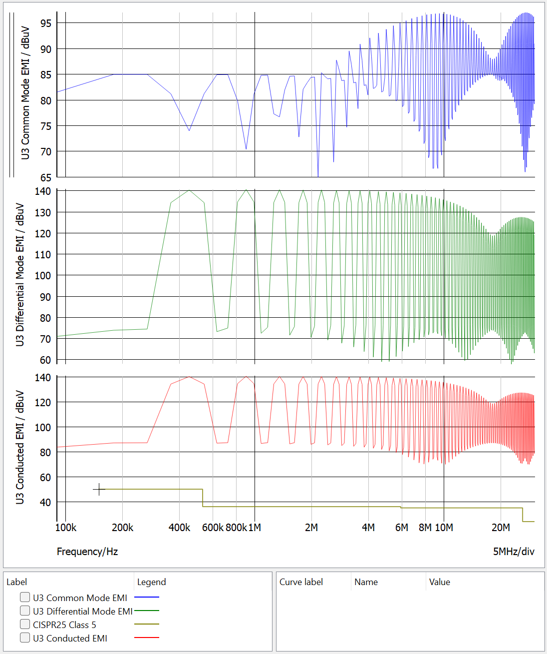 After the calculations are complete, the specified measurement curves will be plotted on the same graph as the FFT results, allowing comparison with overlaid EMI standards (if any have been selected). The EMI measurements are performed according to the specifications in the CISPR16.1 standard. Therefore for a well-constructed model, the simulation will provide similar results to a realistic EMI test, showing whether the circuit meets EMI standard specifications.