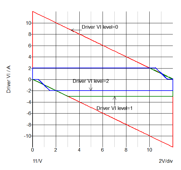 Following the red curve which is for the Level 0 model, the driver starts with the output voltage at 0V and driver current at 0A.