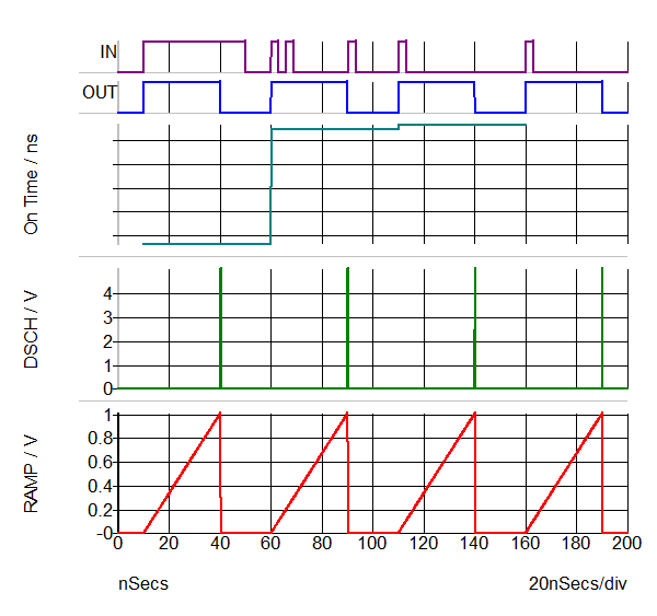 The waveforms shown below are for a test circuit with the one shot time duration set to 30ns. A brief description of the behavior is as follows:
