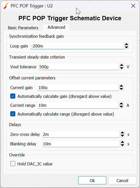 | Hold DAC_IC value | Check this box to make the PFC POP Trigger output a constant current corresponding to the entered DAC IC value during an entire transient. This stops the PFC POP Trigger from synchronizing. Checking this box and setting DAC IC = 0 is equivalent to disabling the PFC POP Trigger. |