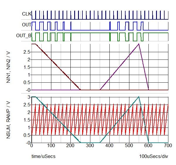 • Since the Include toggle flip-flopis checked, OUT is triggered on every other CLK trailing edge. Since the Ramp signal is the only PIN input, PSUM = PIN2 = RAMP in  the test circuit.