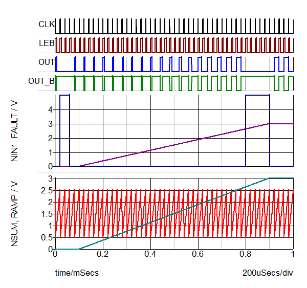 In the waveform below, OUT is always low when FAULT is high. The NO_RESET signal is used to define a minimum pulse width for OUT, which generates the leading-edge blanking. Since the Include toggle fliep-flop is checked, OUT is triggered on every other CLK trailing edge.