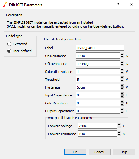 | Limit maximum off resistance | Checked | none | Limits the off resistance for the IGBT. For some SPICE models, this will produce a SIMPLIS model which runs faster. |