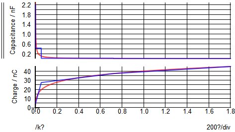 Below is a typical PWL approximation of the charge vs. voltage characteristic of the Collector-Emitter capacitor. As SIMPLIS uses the charge vs. voltage in a simulation, this characteristic curve is used to curve fit the non-linear capacitance. As a result, the capacitance is piecewise constant, and is calculated from the charge vs. voltage characteristic. The SPICE curves are shown in red and the PWL curves in blue.