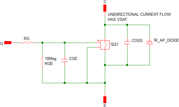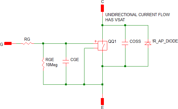 Level 1 models a switch with on/off resistance values, anti-parallel diode, and gate capacitance, plus a lumped-linear Coss capacitance across collector and emitter terminals. The Level 1 Model can be used for power stage simulations, including Quasi-resonant, LLC, and phase-shifted bridge topologies,as well as for AC Bode Plots and for simulating output voltage during load and line transient.