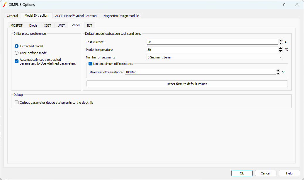 The default test conditions for the Extract Zener Parameters dialog can be set from the menu