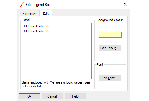| Font | Select button Edit Font... to change font. To change the default font select menu then select item Legend Box. Edit font as required. |