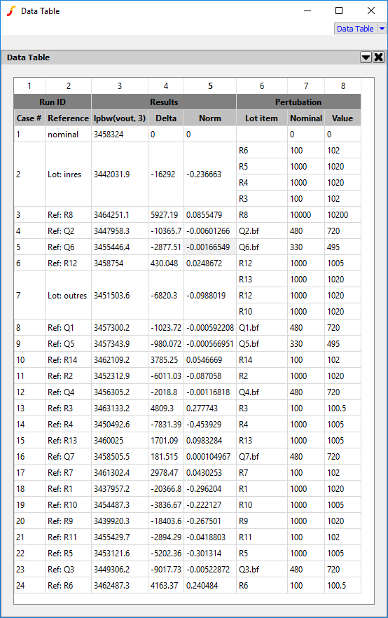 | Norm | Normalised sensitivity A value that indicates the sensitivity of the item being perturbed to the measurement result, independent of the level of perturbation. The value is calculated from Delta/measurement * nominal-value/perturbation. This value can be used to identify components that are unduly sensitive and which could indicate a design flaw. Note that this value does not have much meaning for measurement results that are nominally zero such as the offset of a differential amplifier. Double clicking the header will sort the table according to the magnitude of the value in this column |