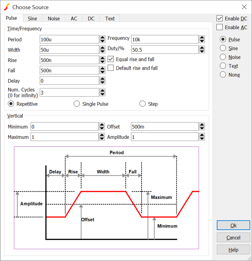 | RISE | Rise time i.e time to change from V2 to V1 | PERIOD/1000 | No |