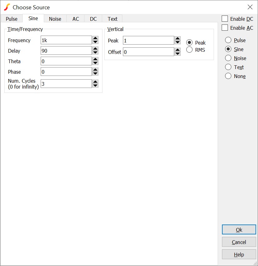 The text sheet may also be used to define a single frequency FM or exponential source using traditional SPICE syntax. Refer to Simulator Reference Manual/Analog Device Reference/Voltage Source/Exponential Source and Single Frequency FM for details.