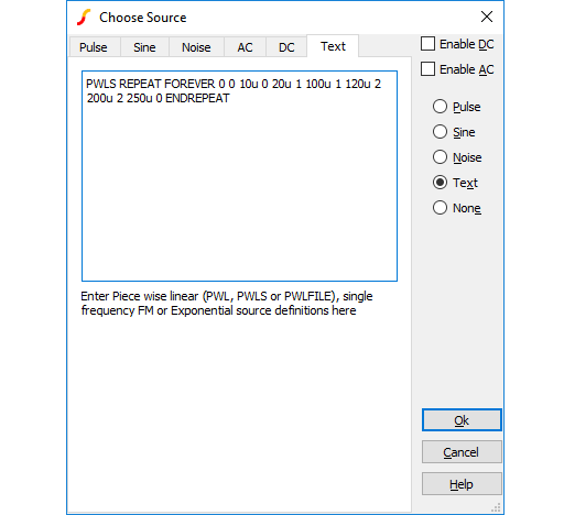 This device can be used to describe a piece wise linear source. A PWL source can describe any arbitrary wave shape in terms of time-voltage or time-current pairs. To place a PWL source select menu or .
