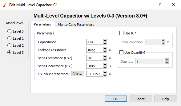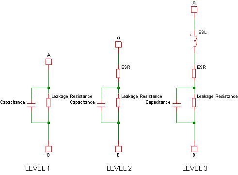 The Multi-Level Capacitor has four model levels. As the level increases, additional parasitic circuit elements are added. This capacitor, available with Version 8.0 or later, is used to model a wide variety of capacitor types where the number and type of parasitic circuit elements can be configured.