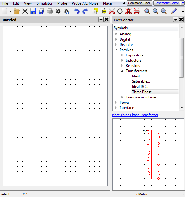 Virtually all available parts may be selected using the part selector. There are differences between SIMetrix and SIMPLIS modes in how parts located in the model library are placed; in SIMetrix mode the part appears directly in the part selector whereas in SIMPLIS mode, the part selector directs you to the model library browser. There are options to change this behaviour - see PartSelShowSimplisModels in List of Options.