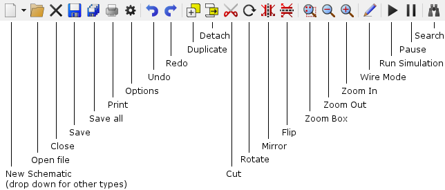 In the following notes references are made to the schematic tool bar. The diagram above shows the standard toolbar and the function of each button.
