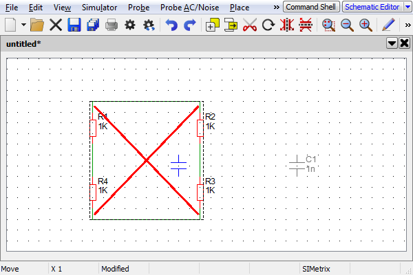 Moving an element into a group with warning of group destruction. The wires and resistors have been grouped together. The capacitor is being dragged over the grouping. A warning box with a red cross appears around the group to indicate that placing the capacitor here would break the grouping of the elements. |
