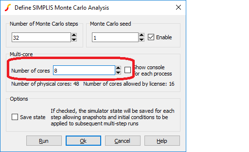 If your system and your license permit, you can specify multiple processor cores to be employed for multi-step analyses. This can substantially speed up the run. For example, suppose you have a 4 core system and wish to run a 100 step Monte Carlo analysis. The 100 steps may be split across the 4 cores each doing 25 steps each. In most cases this improve the run time by at least a factor of 3.