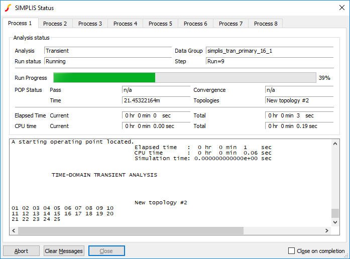 Start the run in the usual way for a multi-step run. You will see the usual SIMPLIS status box but with the difference that there will be multiple tabs, one for each process running as shown below: