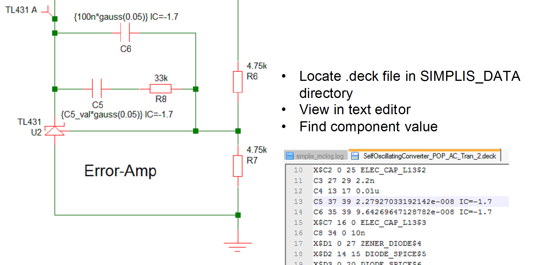 The part values used for a particular step can be found by studying the .deck file that is created for every SIMPLIS run. To do this, follow the procedure for finding and using the seed value as described above. Then after the single run is complete locate the file with the .deck extension. This will be located in the SIMPLIS_DATA folder and will have a name the same as the top level schematic but with the extension .deck. So if your schematic is called DC-DC-Converter.sxsch, the deck file will be called DC-DC-Converter.deck and will be located in the SIMPLIS_DATA folder.