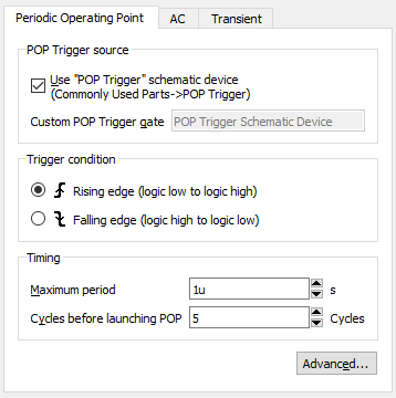 Periodic Operating Point (POP) finds a steady state operating point of switched systems that are periodically driven or self-oscillating. The predominant application of this analysis mode is to rapidly find the settled condition of a switching power supply without having to simulate the entire power up sequence. This dramatically speeds up the analysis of design's behaviour under different load conditions.